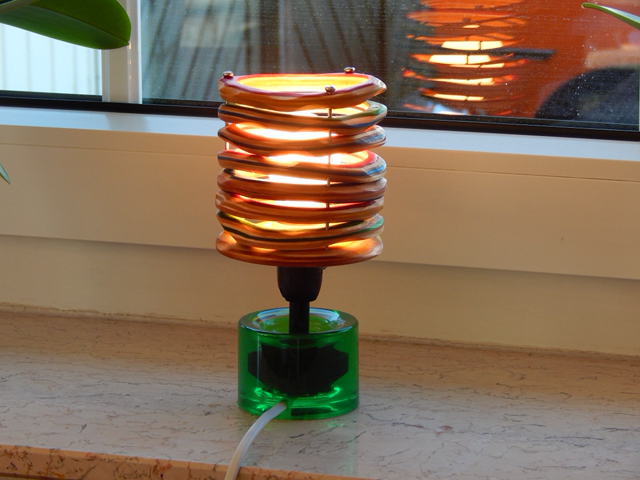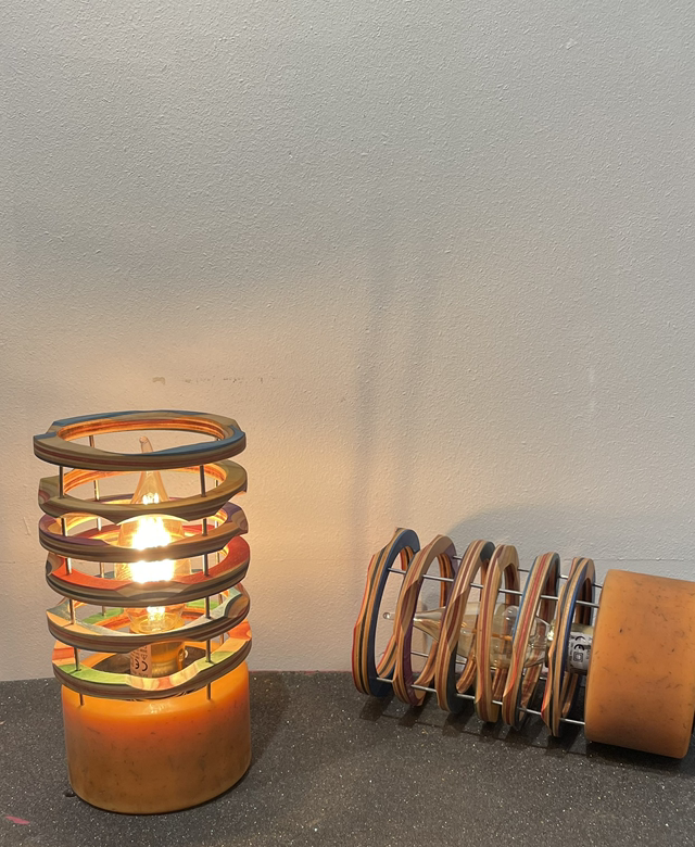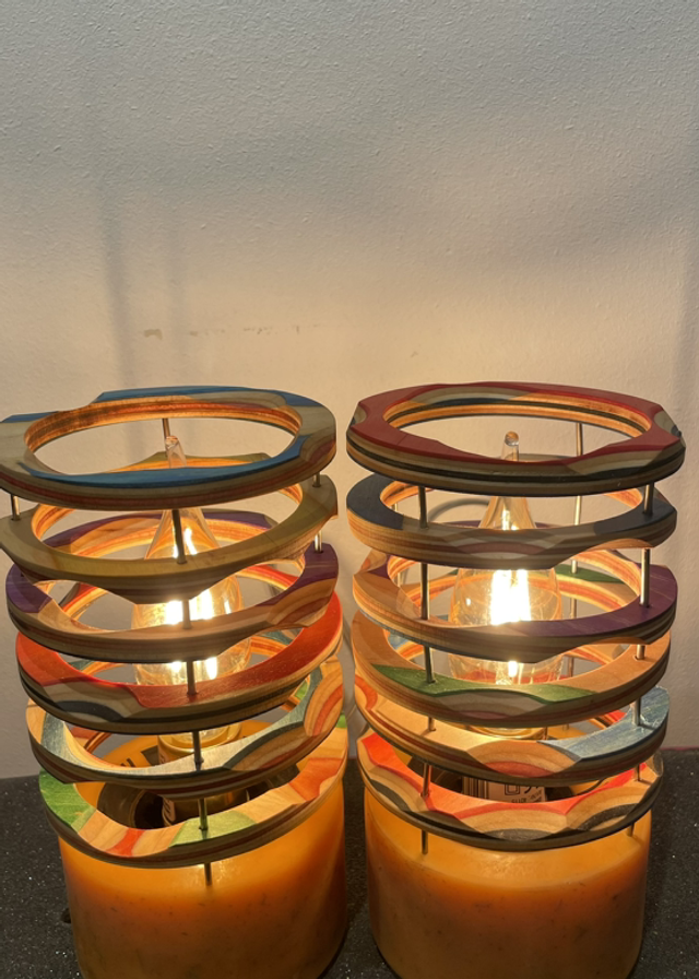 Beispielbild! Diese Tischlampe ist ein Hingucker! Ringe aus alten Skateboards aufgeschoben auf alten Fahrradspeichen. Steht auf einer Longboardrolle als Fuß. . Du kannst die Farben der Skateboards wählen und hast ein absolutes Unikat!